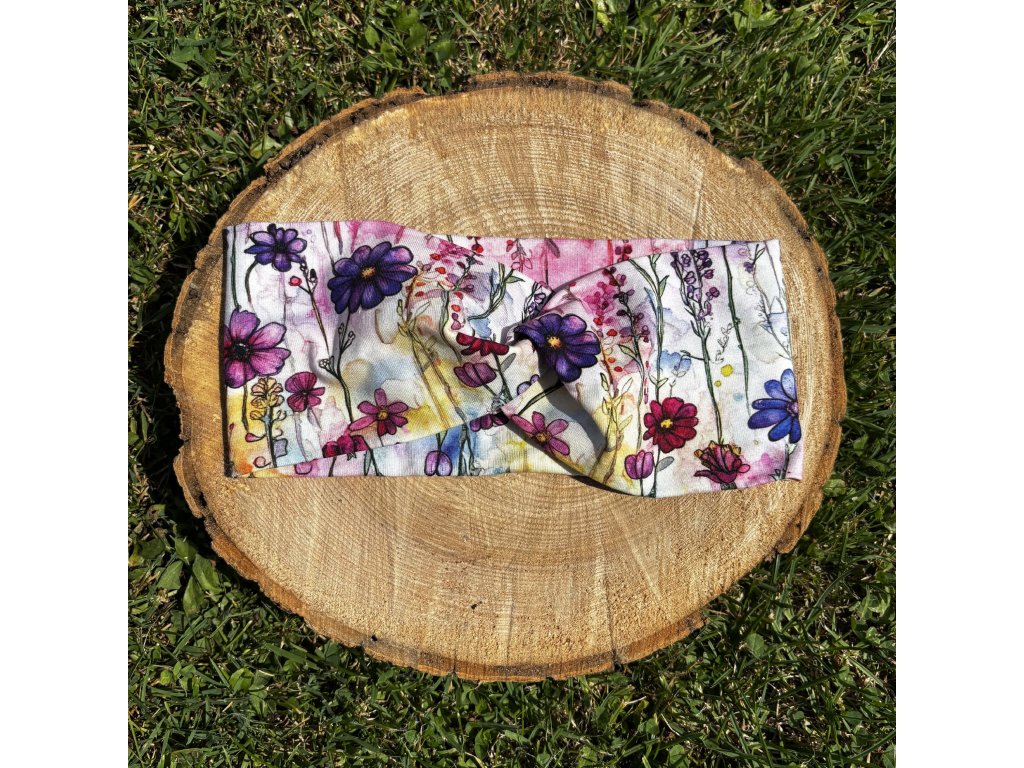 Turbanová čelenka z bavlněného úpletu potištěného na Slovensku.